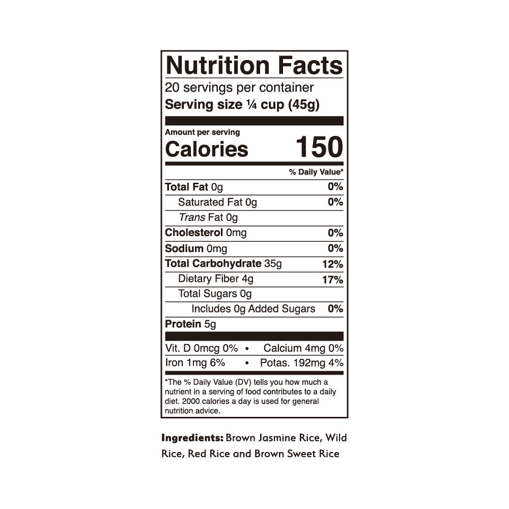 Balanced blend of Brown Jasmine, Wild Rice, Red Rice and Brown Sweet Rice offering a deep, earthy taste with a satisfying chew.